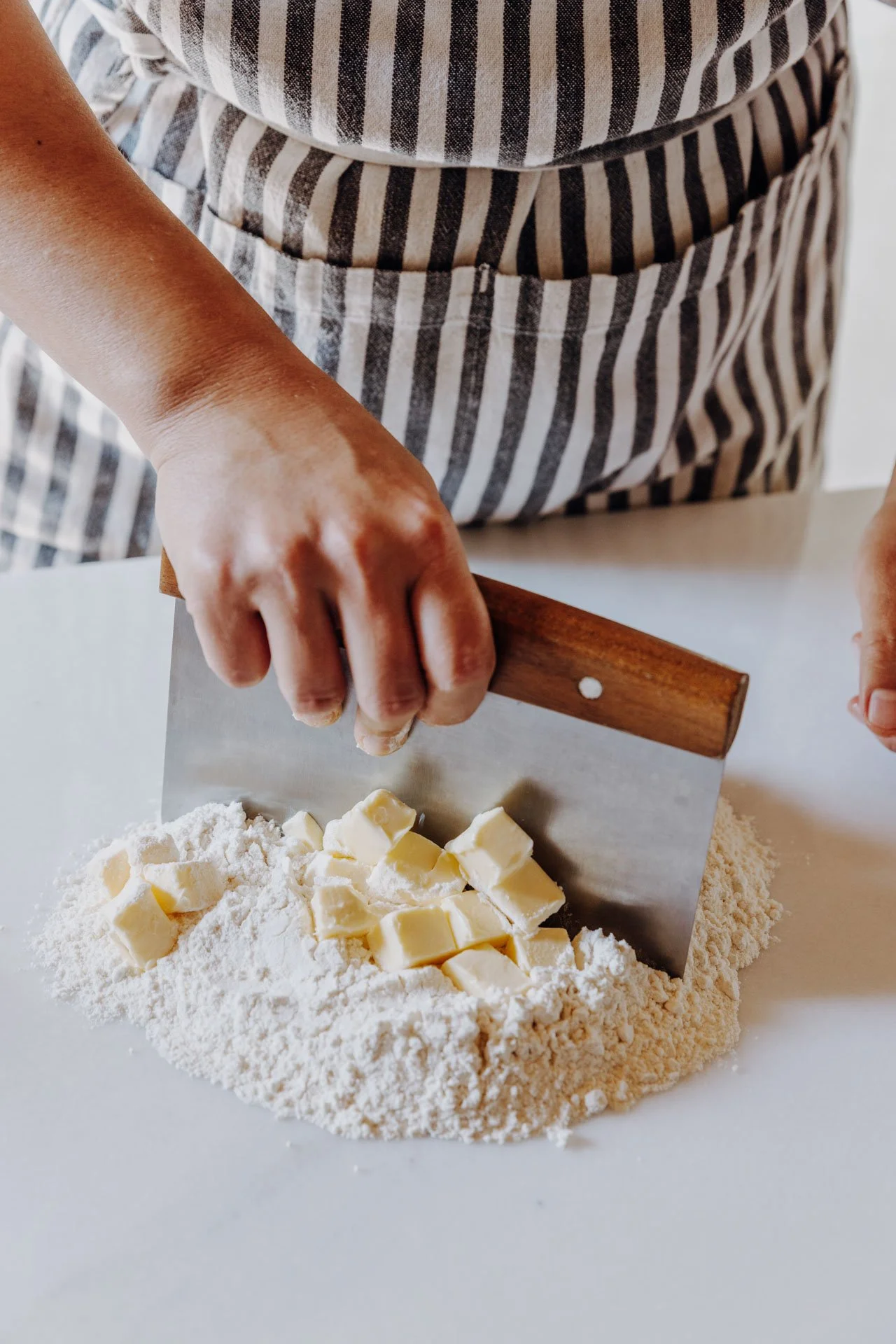 Für unser liebstes Mürbeteigrezept verwenden wir kalte Butterstückchen, die im ersten Schritt mit dem Mehl vermengt werden. Im Fachjargon spricht man von einer Sablage: Butter und Mehl werden fein zerrieben, es entsteht eine feinkrümelige Masse, fast so wie Sand. Durch das Zerreiben umschließt die Butter das Weizenprotein, welches normalerweise elastische Teige bildet. Man erhält die gewünscht mürbe Konsistenz. In Frankreich wird Mürbeteig, der auf diese Weise zubereitet wird, deshalb Pâte sablée genannt. Hierzulande spricht man manchmal auch von Sandteig.