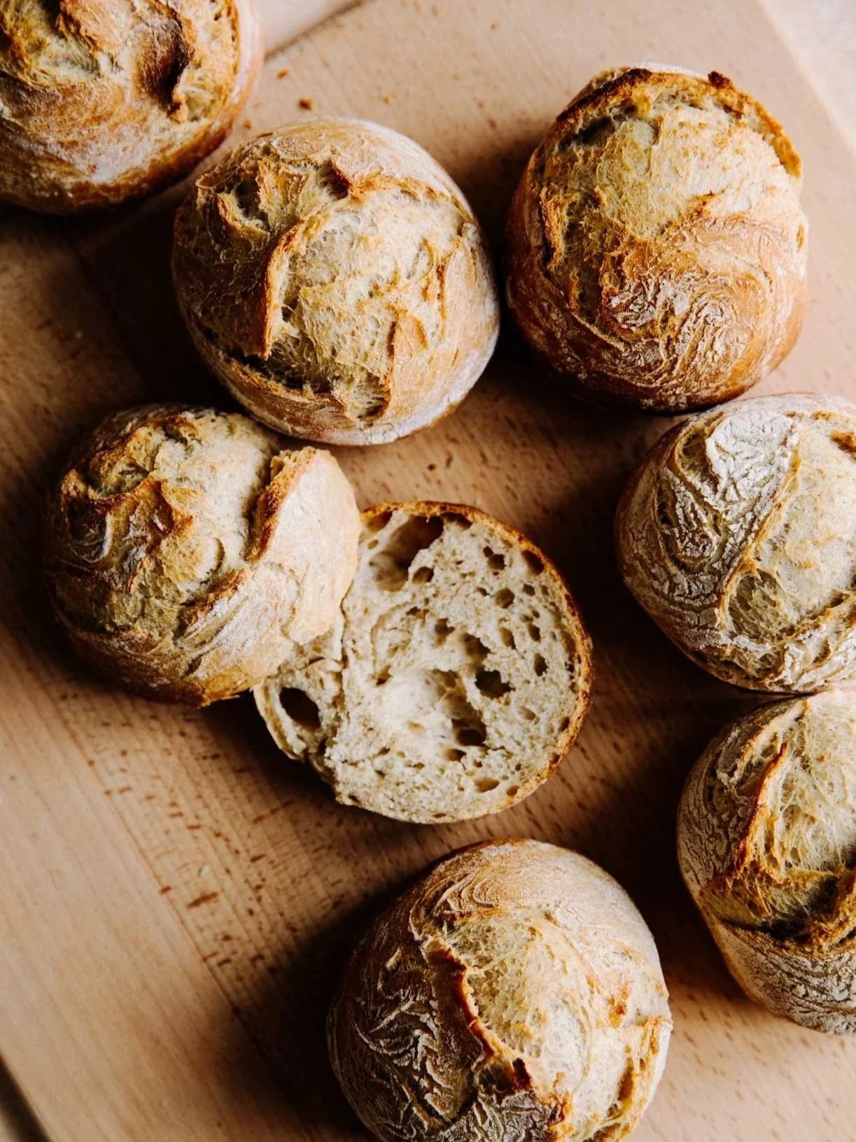 Die Teiglinge umdrehen und direkt auf den Backstein/-stahl oder auf Backpapier auf das Backblech setzen. Insgesamt ca. 20 Minuten goldbraun backen. (Idealerweise die ersten 10 Minuten mit Dampf backen und diesen dann ablassen.) Nach etwa 10 Minuten kontrollieren, ob sie schnell Farbe annehmen. In diesem Fall die Temperatur auf 210-220 °C reduzieren und die Brötchen fertig backen.