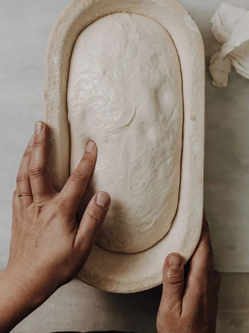 Anhand des Fingerdrucktests kannst du überprüfen, ob dein Teigling bereit zum Backen ist. Drücke dazu vorsichtig mit einem feuchten oder bemehlten Finger (am besten seitlich) in den Teig: