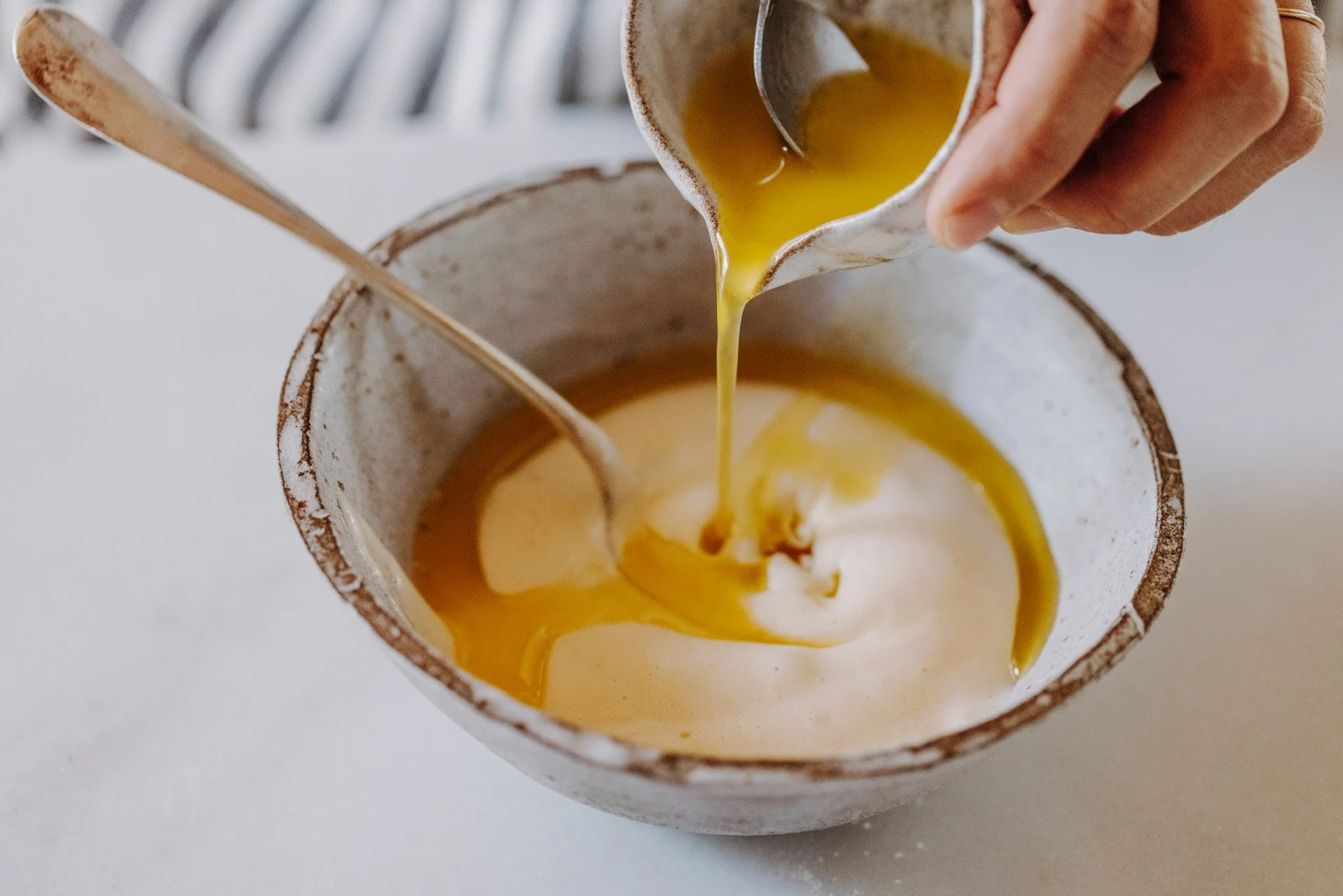 Bei Wiener Masse wird zum Schluss Butter in die Masse eingearbeitet: Verrühre dazu erst ein paar Esslöffel der Masse mit der flüssigen Butter.