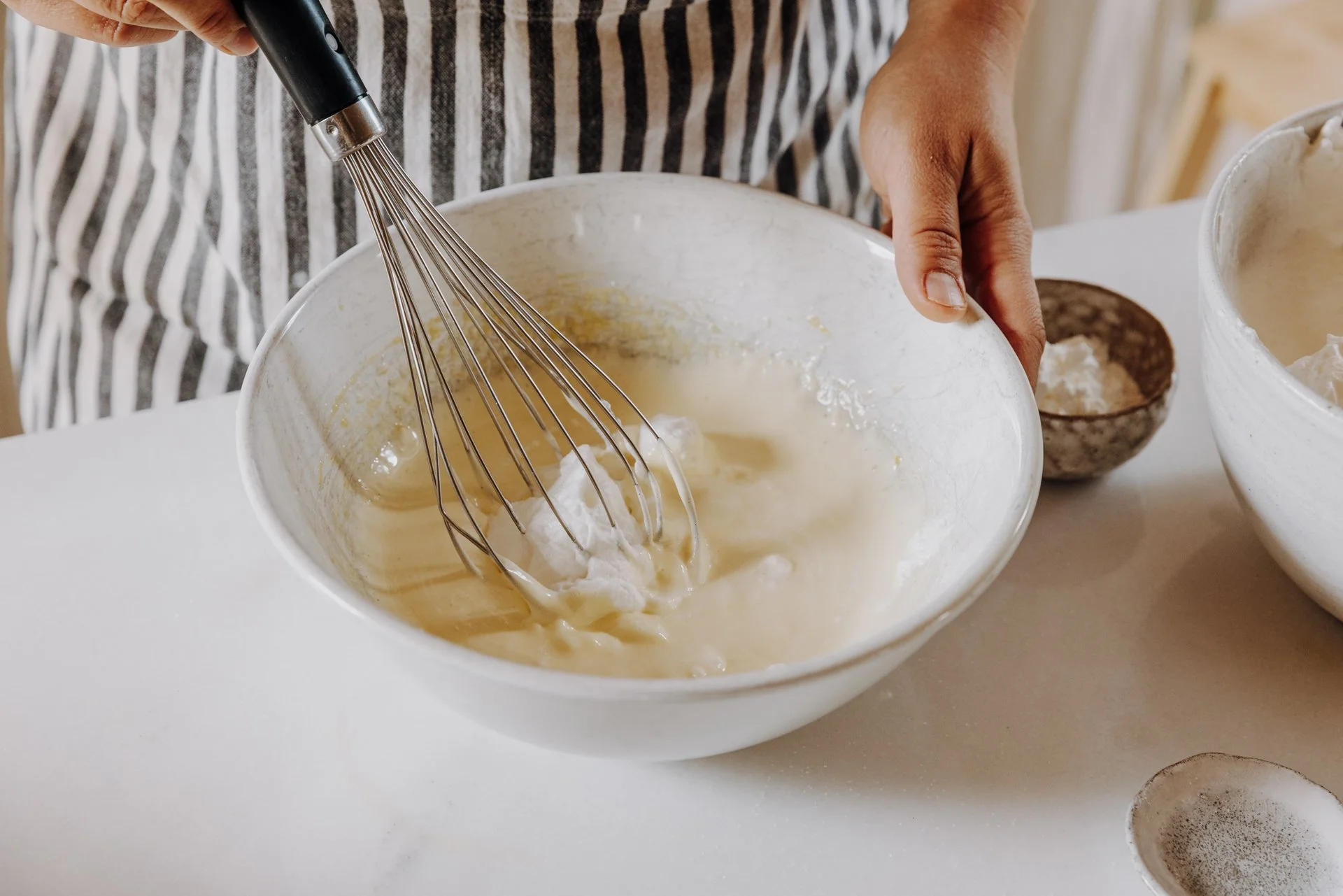 Mehl und Eischnee kannst du abwechselnd, in mehreren Portionen, unterheben. Am besten geht das mit einem Schneebesen oder einem Teigschaber.